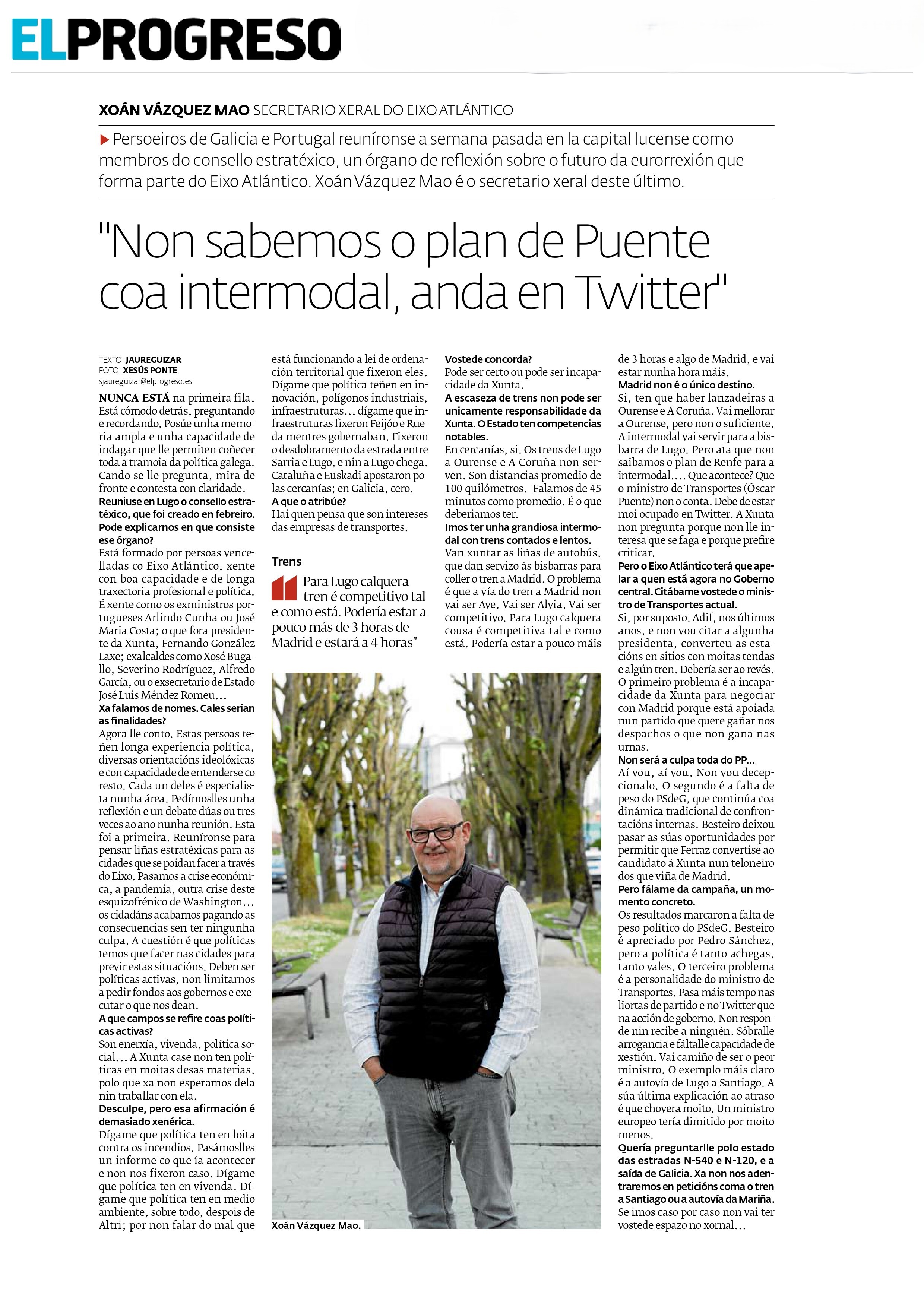 O secretario xeral do Eixo Atlántico, Xoán Vázquez Mao, nunha entrevista en El Progreso de Lugo. Podes ler a entrevista completa aquí