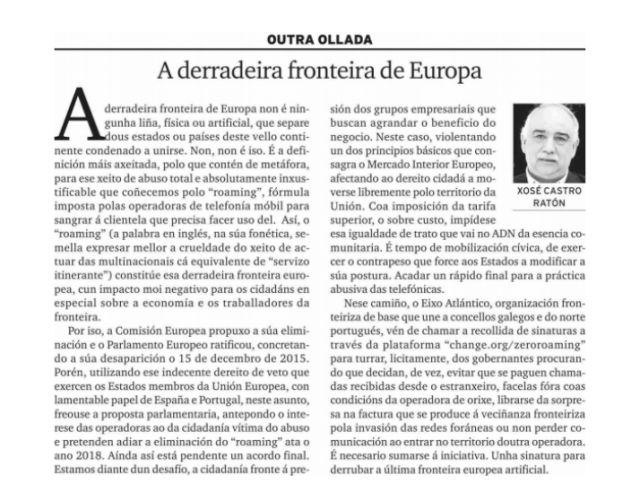 Eixo Atlántico e RIET valoran a data de 2017 para o fin do roaming como un avance importante, pero alertan de que non se deu unha solución para as áreas transfronteirizas